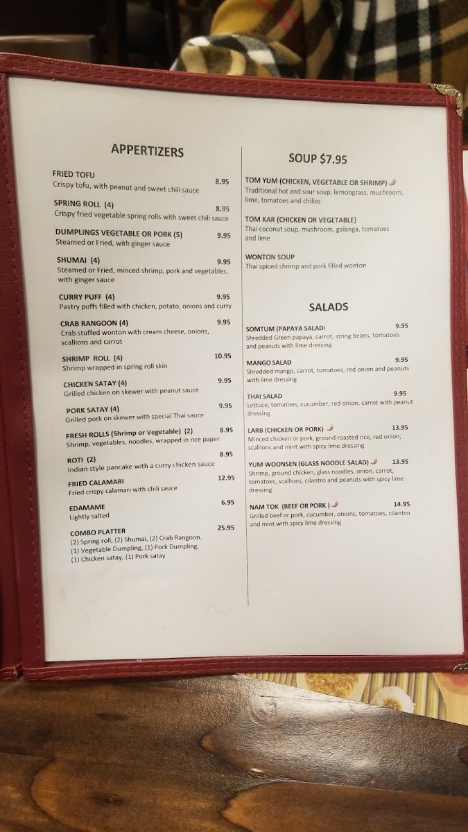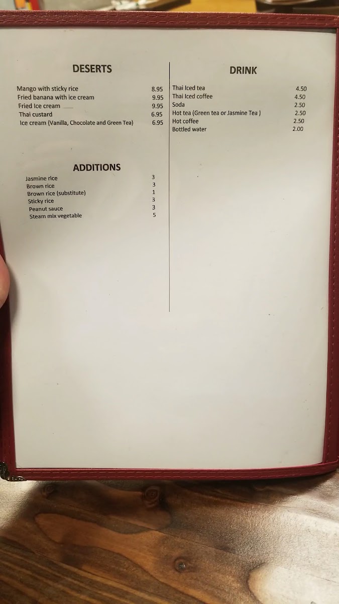 The menu includes a range of classic staples like Massaman Curry and Pad Thai, alongside fresh, vibrant options such as Somtom Salad and Tom Yum Soup. For those looking to share or enjoy lighter bites, items like Chicken Satay and Spring Rolls bring a welcome balance of textures and tastes. Guests can also indulge in sweet finishes like Mango with Sticky Rice or Fried Ice Cream, ideal for rounding out the experience.